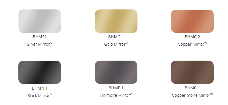 Barrisol Mirror®, the unbreakable mirror, is available in 6 finishes: Silver, Gold, Copper, Copper moiré, Black, Tin moiré