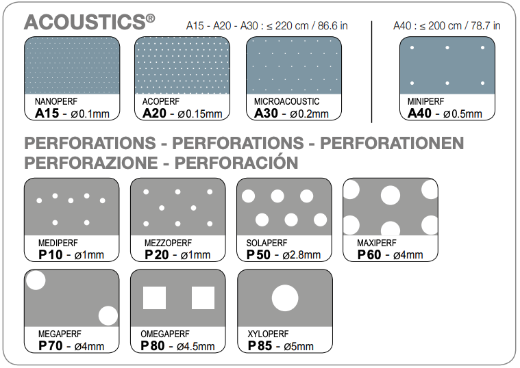 With 6 finishes: Silver, Gold, Copper, Copper moiré, Black, Tin moiré and many different ways to customise your membranes (prints, perforations, back-lighting, etc.), the only limit is your imagination!