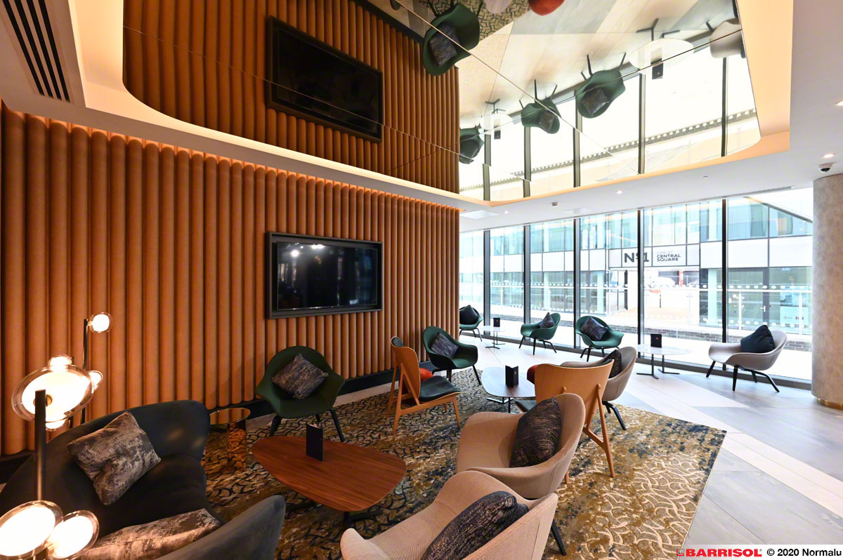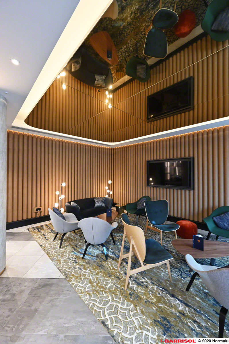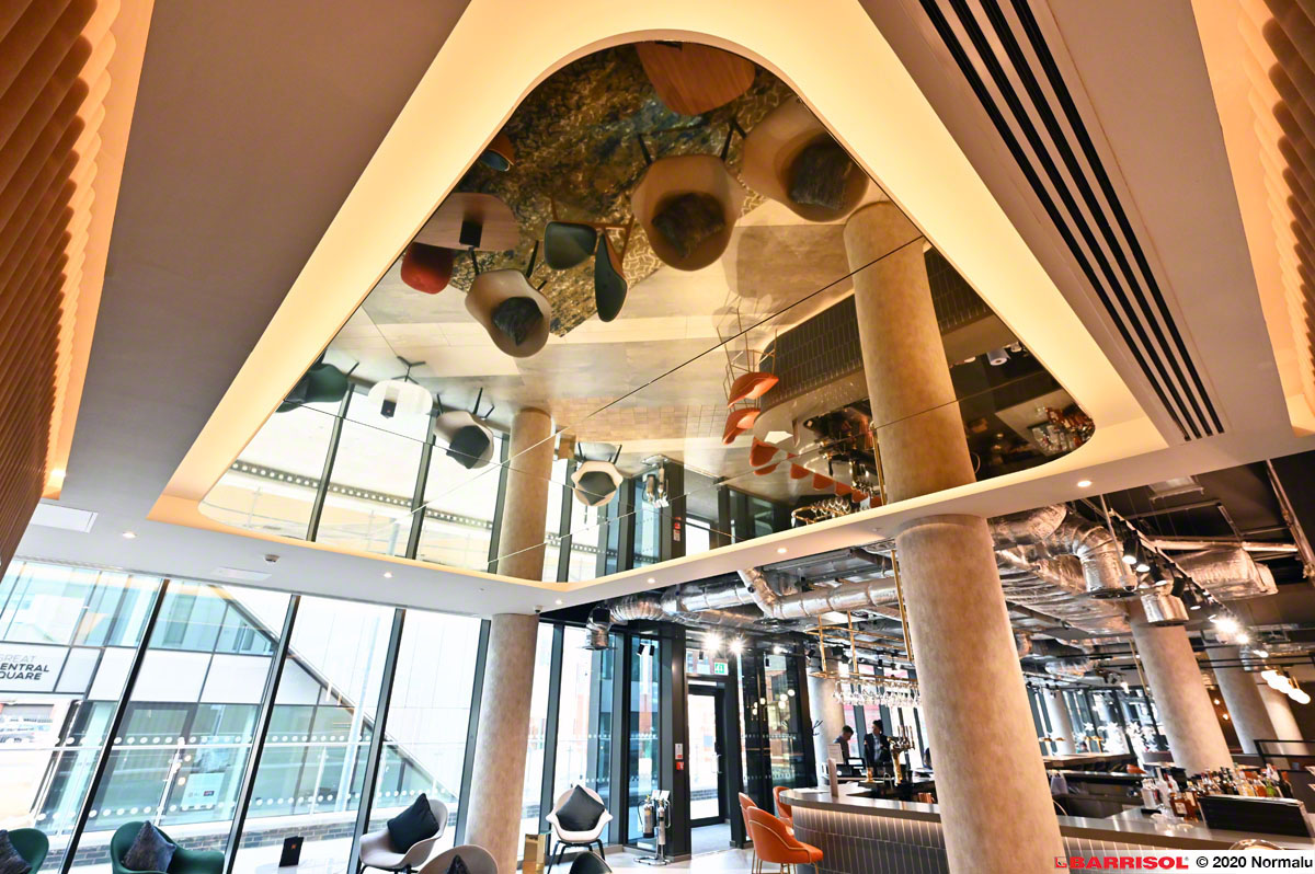 Barrisol Mirror system using the Gold Mirror fabric BHMG1 and Barrisol profile BMR 385/05. Factory curving the corners and incorperation M&E penetrations. LeachRhodesWalker Architects