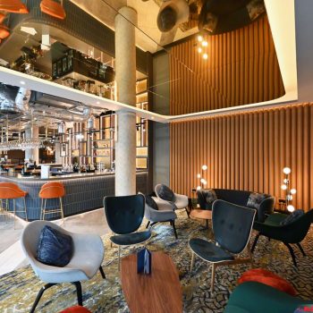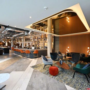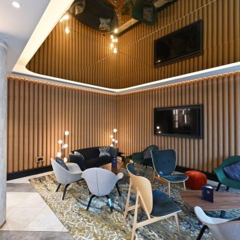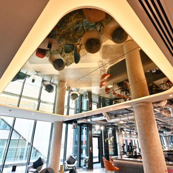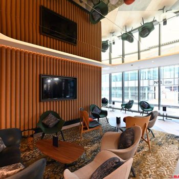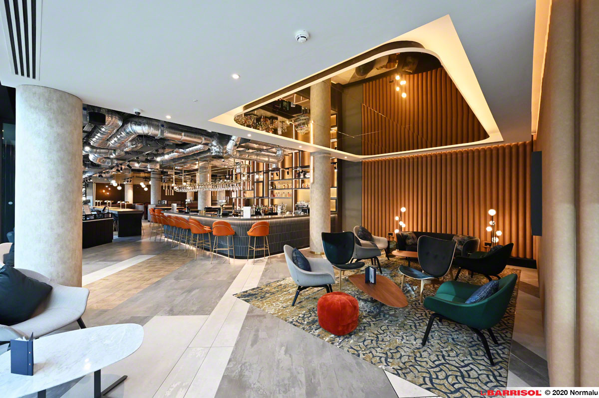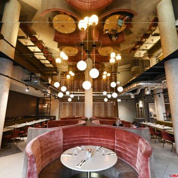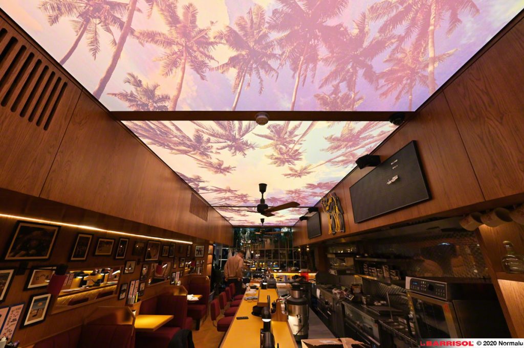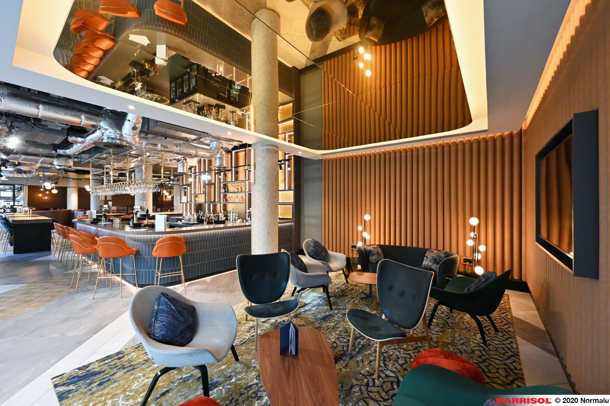 Barrisol Mirror system using the Gold Mirror fabric BHMG1 and Barrisol profile BMR 385/05. Factory curving the corners and incorperation M&E penetrations. LeachRhodesWalker Architects